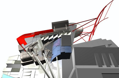 The gallery on the top floor becomes a multifaceted solid that juts out into the sky, and at the point where it connects with the supporting pillars, complex "harts" sprout.