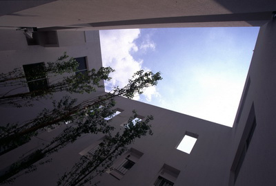 The floor and walls of the inner court are in whites, accentuating the tenderly embraced space.