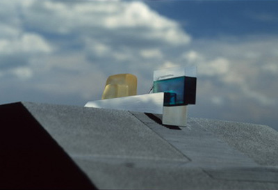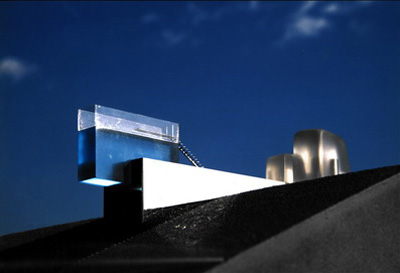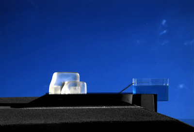 Atop it at one end is a rectangular, fluid shape seemingly cut out of the sea with a knife, and at the other is a form made by turning a hardened piece of the atmosphere out of a mold.