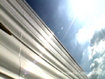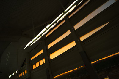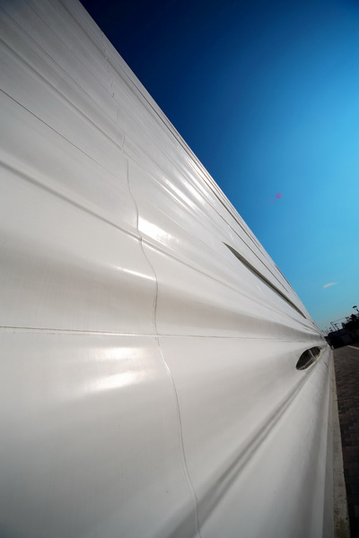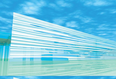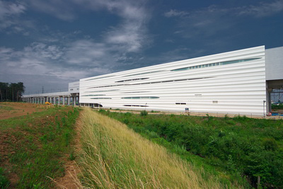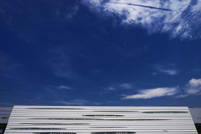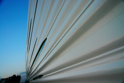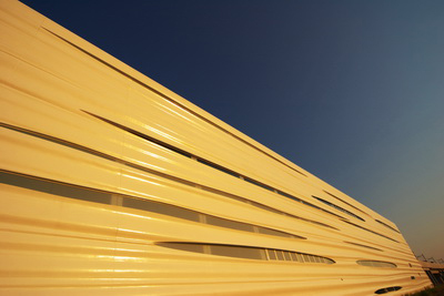 The wave curves are made from Glass-fibre Reinforced Concrete (GRC). Units are sized 5m by approx. 2m, and attached to the structure at intervals of 5m. Interior and exterior walls are opposite faces of the same unit. The exterior side is painted with a coating that causes grime to dissolve naturally.