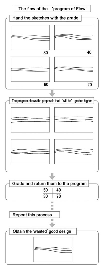 1- 設計者が複数のスケッチを描き、それに自己採点をしてプログラムに渡す。
