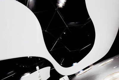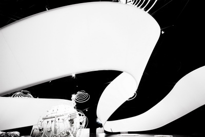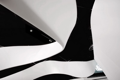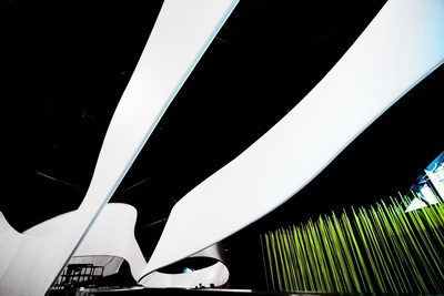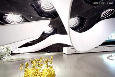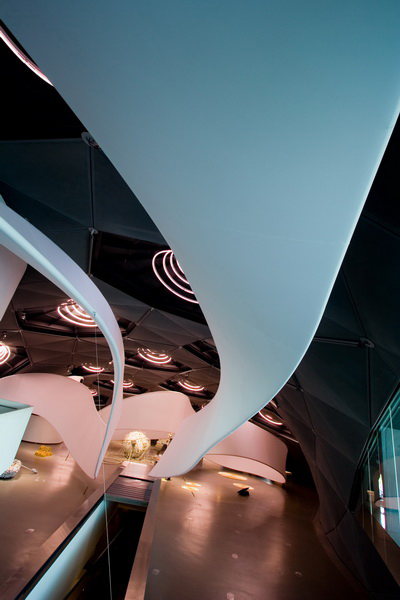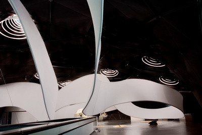 The main exhibition rooms are on two levels. The upper level has a high, protruding ceiling that conforms with the external roofline, while the lower level is flat. The ceiling of the upper level is dotted with skylights and large multi-ringed light fittings that draw the attention of visitors even when the lights are out. There is a moving ramp (another bold choice) that runs through the middle of the exhibition room and the positioning of the works would require some consideration in order to achieve a sense of cohesiveness of the exhibition space as a whole. Rather than the smooth acrylic material used on the exterior, grey paint has been used in the internal space, which further enhances the skylights and the large light fittings on the ceiling.