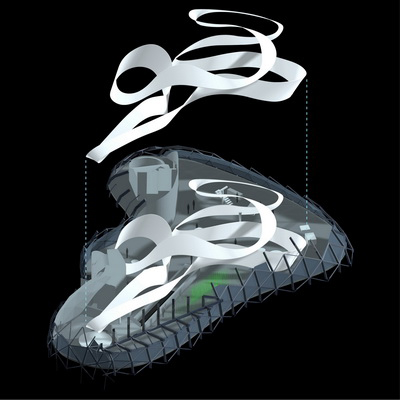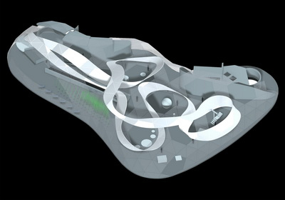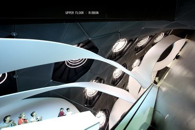 There is a link between this "fluid space comprising a series of curved forms" and Web Frame at the Iidabashi Station on the Oedo Subway Line (2000, Tokyo).