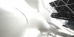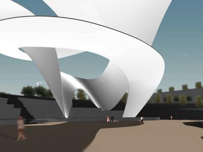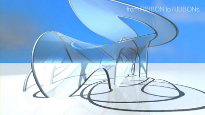 The second proposal was to stretch a surface between two independently varying paths. The result was a ribbon that danced along the two paths, changing its width and height, crossing itself and twisting to open and close and form an overhead canopy.