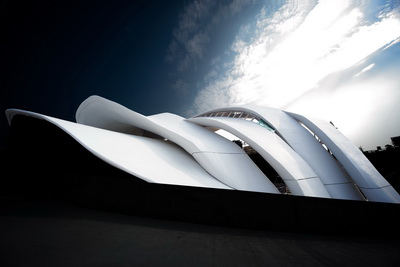 Taking advantage of the configuration of the site, where seating for the audience is carved into the ground, the shell was designed so that only its crest would visible from the street (city) side, with its full extent coming into view gradually as visitors approach via a circuitous route through the park.