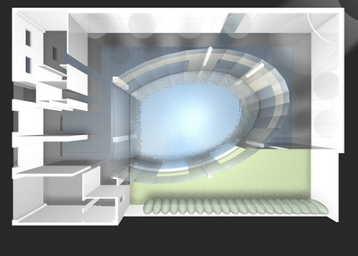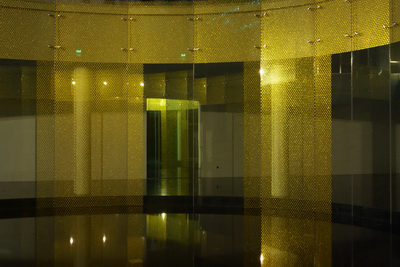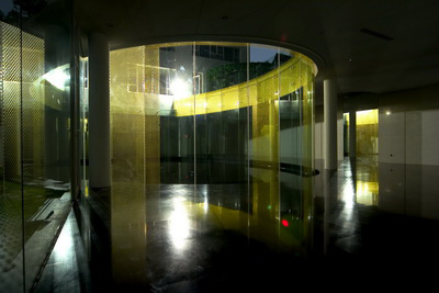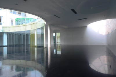 On the other hand, the glass screens which surround the court continue unbroken to form a closed ellipse. The court is paved in black granite, which continues from the interior.