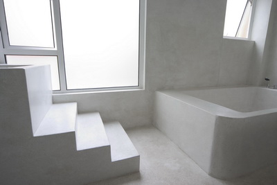 The same intentions are evident in the material used in the main bathroom in the upper storey. Floor, walls, bath, and counter were all created by a craftsman working patiently and painstakingly on site, grinding and polishing single pieces of artificial stone.