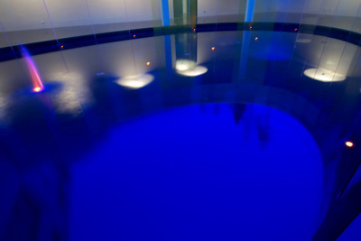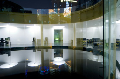 At the same time, the surface of the water functions as a mirror to bring light into the interior. The interior is lit by light reflected from the ceiling and from the top light at the southeastern corner.