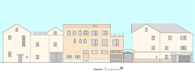 Out of respect for these historical circumstances, the street side is handled in a way that responds to the appearance of the surroundings. The height and depth are about the same as the height and depth of neighboring buildings. The slanted roof, window placement and use of color are also comparable. The street is narrow and lined with large trees, which makes it impossible to view the entire facade in one glance.