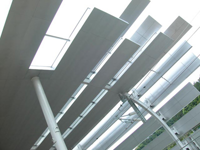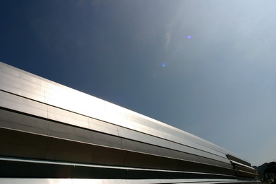 The various pieces running parallel to each other have different surface angles. Different angles lead to different reflections of light. Pieces with different angles reflect sunlight in different ways, according to the time of day and the season. People will see gleams of different types, depending on the time and the approach they take to the station.