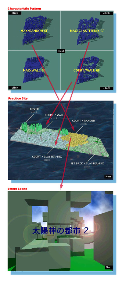 実施の例は「発生街区の都市」プログラムによって生成した街区の上に行なわれている。