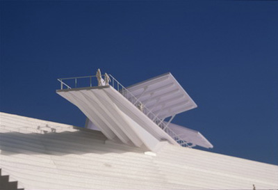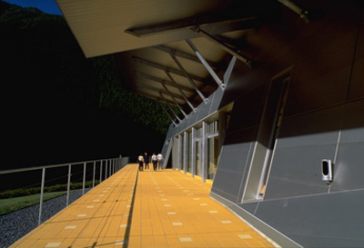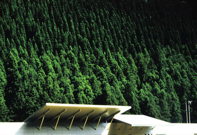Next, a large roof was made to provide shelter from small amounts of rain and snow. The roof is designed so as not to close the space off but to flow with the line of sight of individuals. In this area, snow falls quite often and occasionally snow with a depth of up to three meters accumulates in winter. Thus the architectural conditions for structural design were strict and the structural design of the roof and cantilevered deck presented some challenges.