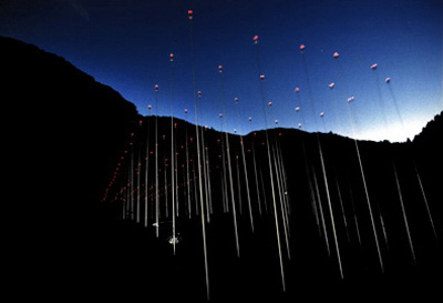 These rods are equipped with solar batteries and luminous diodes on their tips, and usually stand still. However, when the wind blows, they bend gently and sway. The 150 rods sway slowly to the wind in a gentle rhythm as if the wind were blowing through a grassy field. During the night, the luminous diodes, charged by the sunlight during the day, start to blink causing the effect of light swaying in the wind.