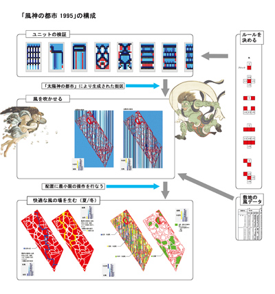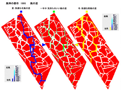 「発生街区の都市」および「太陽神の都市-2」プログラムで生成した街区をベースとし、それに最小限の操作をおこなうことで、望ましい風の街を発生させようとしている。