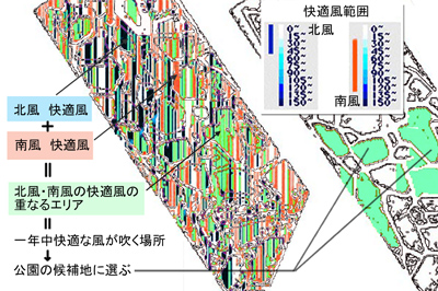 図で、色の濃さは風の強さを表すが、そのなかで、赤い部分は「適度な」風のエリアである。つまり、赤い部分が多いほど、良い風の街ということになる。